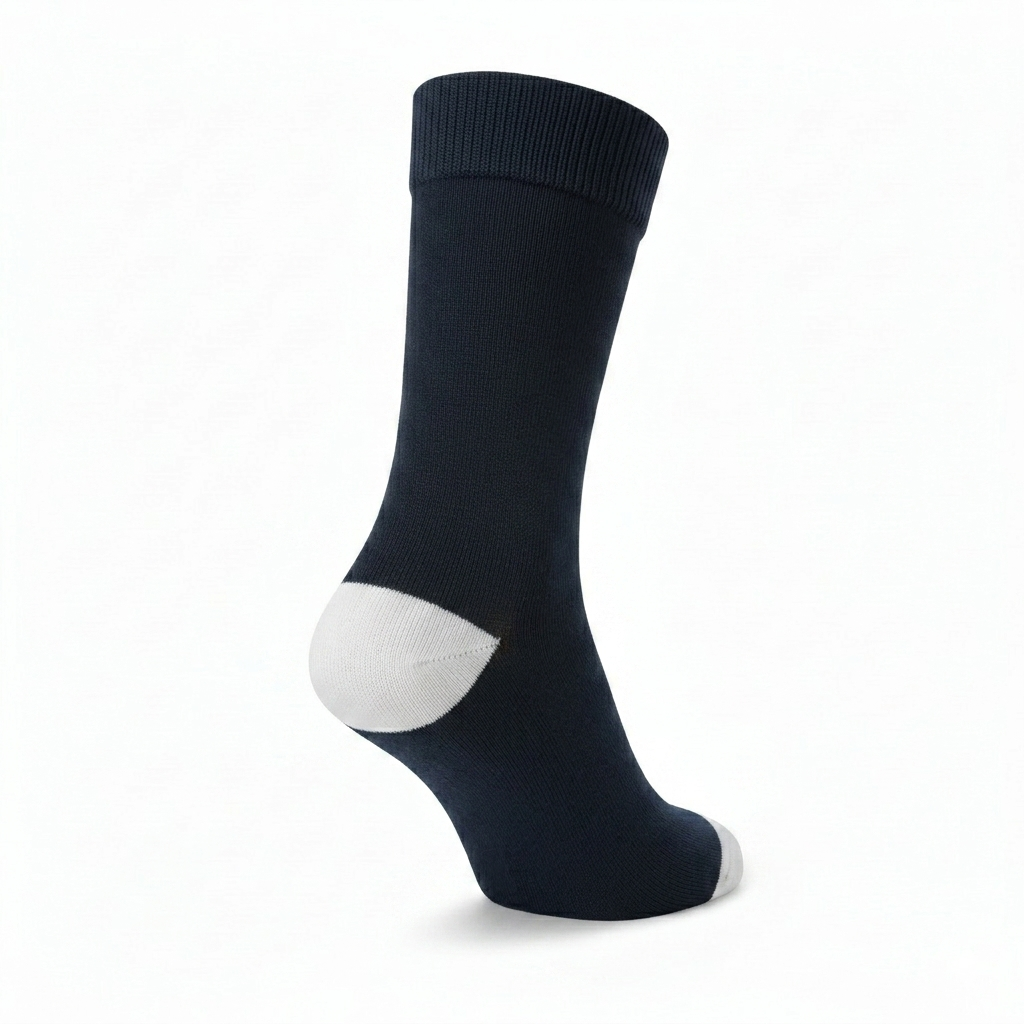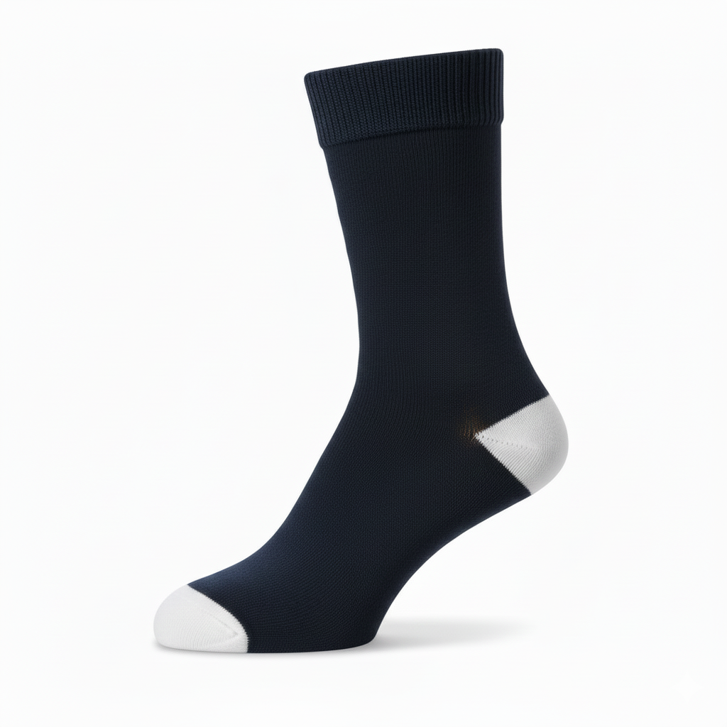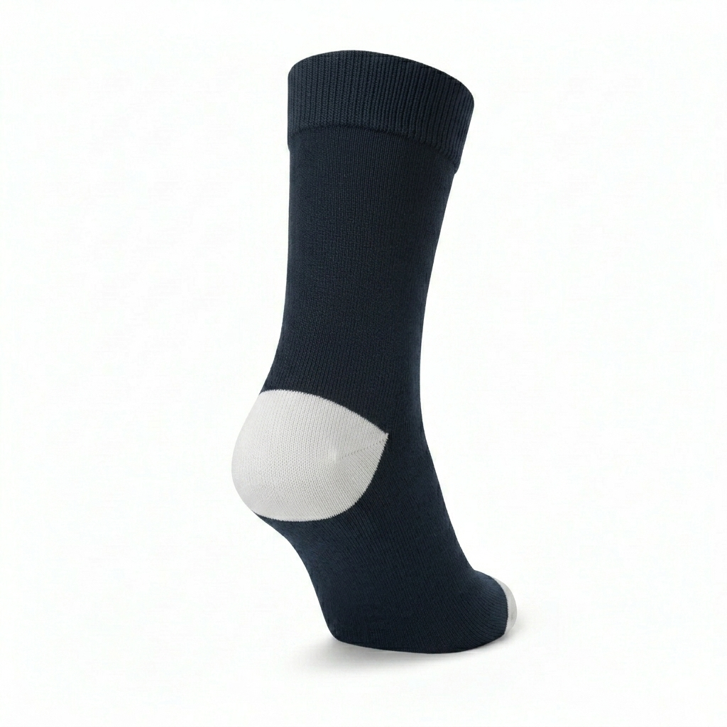 La puntera, el taló i la vora superior acanalada estan acabats en el mateix blau marí sòlid del fons del mitjó. Aquest detall no només reforça la coherència visual de la peça, sinó que també aporta una sensació de marc estructurat que unifica tot el disseny. A més, aquests acabats tenen una funció pràctica, ja que ajuden a dissimular el desgast en les zones de més fricció i asseguren una major durabilitat estètica.