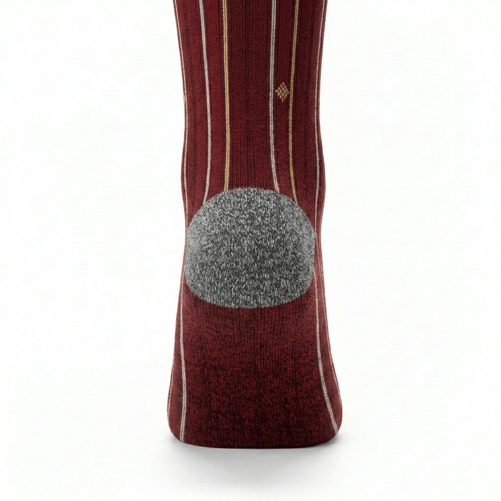 Pel que fa als acabats, el taló, la puntera i la vora superior acanalada es mantenen en el mateix vermell bordeus sòlid de la base. Aquesta decisió de disseny aporta cohesió, equilibri i estabilitat visual, emmarcant el patró central i evitant una saturació excessiva de detalls a les zones estructurals del mitjó.