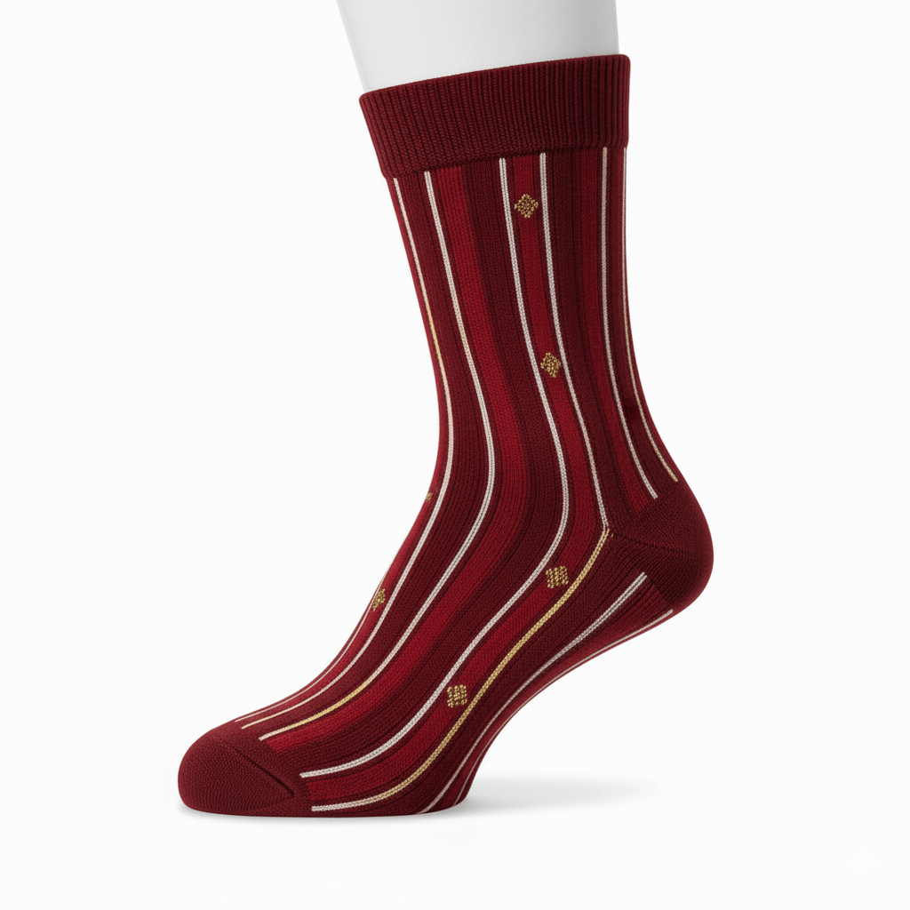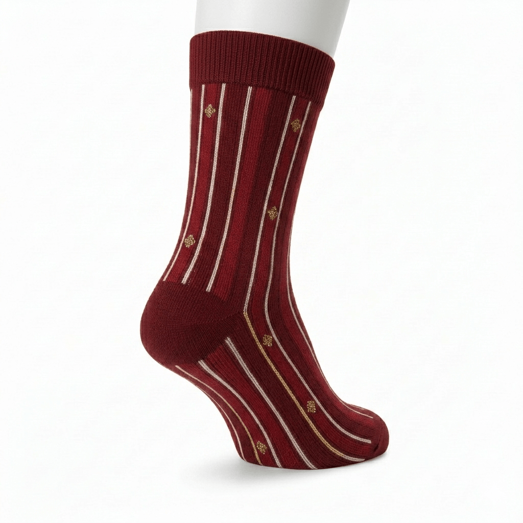 Aquesta peça presenta un mitjó amb un disseny ric i elaborat que combina ratlles i motius geomètrics. El color base del mitjó és un vermell bordeus intens i fosc. El teixit és visiblement acanalat (de canalé). El patró està format per ratlles verticals que s’alternen: una ratlla més ampla del vermell bordeus base, una ratlla més clara i brillant (vermell robí), i una fina línia de color blanc pur. A més, es distingeix una fina ratlla de color daurat que accentua el caràcter luxós. El detall més elegant són els petits motius geomètrics daurats (que semblen rombes o petits estels de quatre puntes) que estan col·locats a intervals regulars sobre les ratlles vermelles més fosques. El taló, la puntera i la vora superior acanalada mantenen el color vermell bordeus sòlid, proporcionant una definició clara al disseny. Aquest mitjó és ideal per a ocasions formals on es vulgui afegir un toc d’opulència i sofisticació.