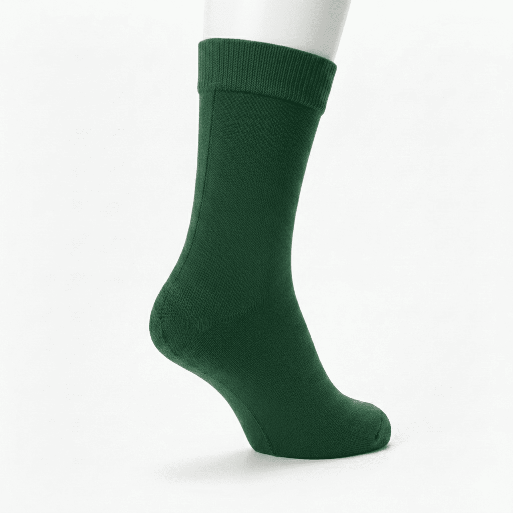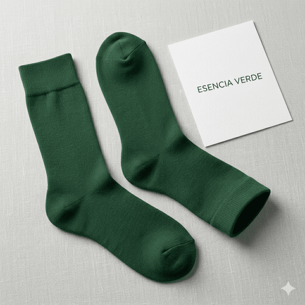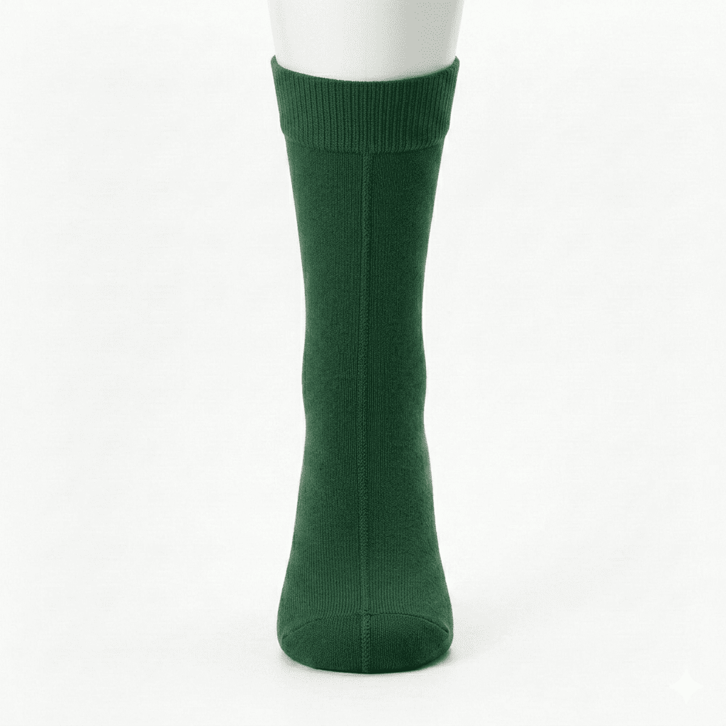 Aquesta imatge mostra un mitjó amb un disseny completament llis, minimalista i d’estètica sòbria, on el protagonisme recau íntegrament en la intensitat i uniformitat del color. La peça està tenyida en un verd fosc i ric, amb matisos que recorden el verd bosc o el verd ampolla, un to profund i elegant que transmet tradició, discreció i sofisticació atemporal.