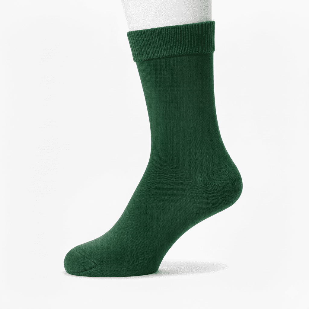 mitjó amb un disseny totalment llis i d’un color intens i uniforme. El color de tota la peça és un verd fosc i ric, semblant al verd bosc o verd ampolla, la qual cosa li confereix un aspecte elegant i tradicional. El teixit sembla ser un punt fi i dens, creant una superfície llisa i sense patrons, ideal per a aquells que busquen un toc de color subtil però sofisticat en el seu vestuari. És un mitjó de mitja canya, de tall clàssic. La uniformitat del color verd fosc es manté a la puntera i al taló, evitant qualsevol contrast. L’única variació de textura es troba a la vora superior, o puny, que és àmplia i acanalada, assegurant una subjecció ferma i còmoda al panxell. Aquest tipus de mitjó de color sòlid és molt versàtil, ja que pot utilitzar-se per a afegir un toc de color a un vestit neutre (gris o blau marí) o per a complementar un estil casual amb pantalons khaki o texans.