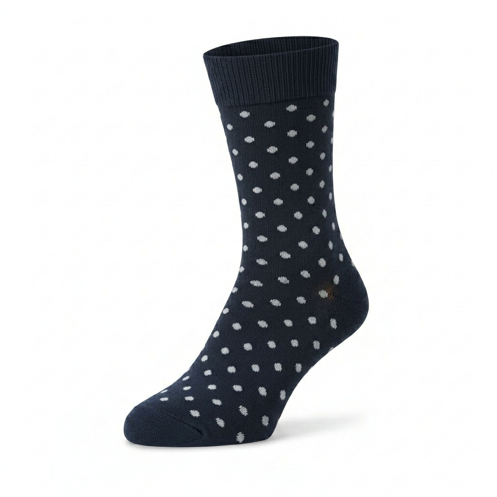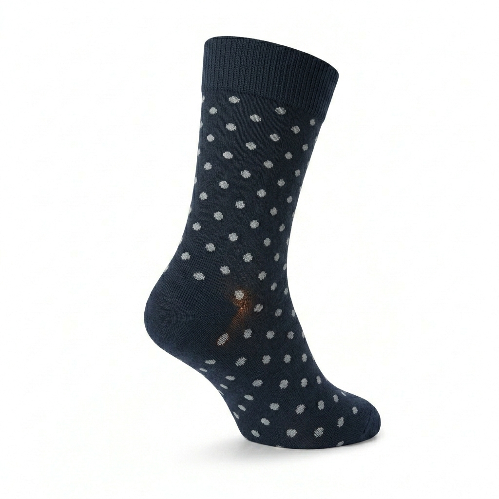 mitjó amb un disseny clàssic de punts (o topos) que és elegant i atemporal. El color de fons de tota la peça és un blau marí fosc i sòlid, gairebé negre. El patró del mitjó es compon de petits punts rodons i blancs que es distribueixen de manera uniforme per tota la superfície del mitjó, des de la puntera fins a la part superior de la cama. La repetició d’aquests topos blancs sobre el fons fosc crea un contrast visual subtil però atractiu, ideal per a afegir textura i interès a un vestit formal o un conjunt de business casual. El mitjó és de teixit llis i fi, suggerint una peça còmoda de mitja canya. Tant la puntera com el taló es mantenen en el color base blau marí, assegurant la uniformitat. La vora superior, o puny, és àmplia i acanalada del mateix color blau marí, proporcionant una subjecció segura i neta.