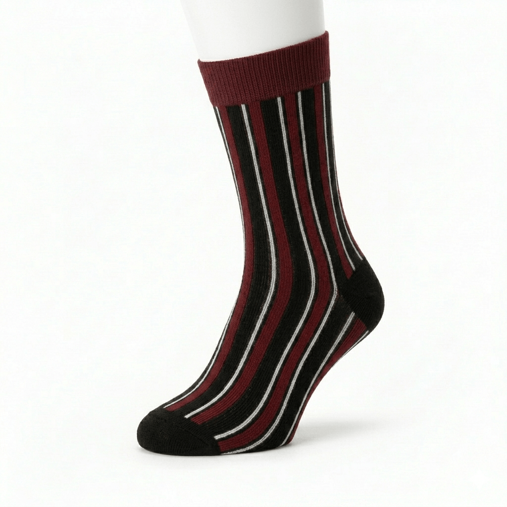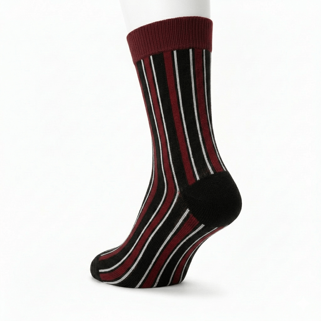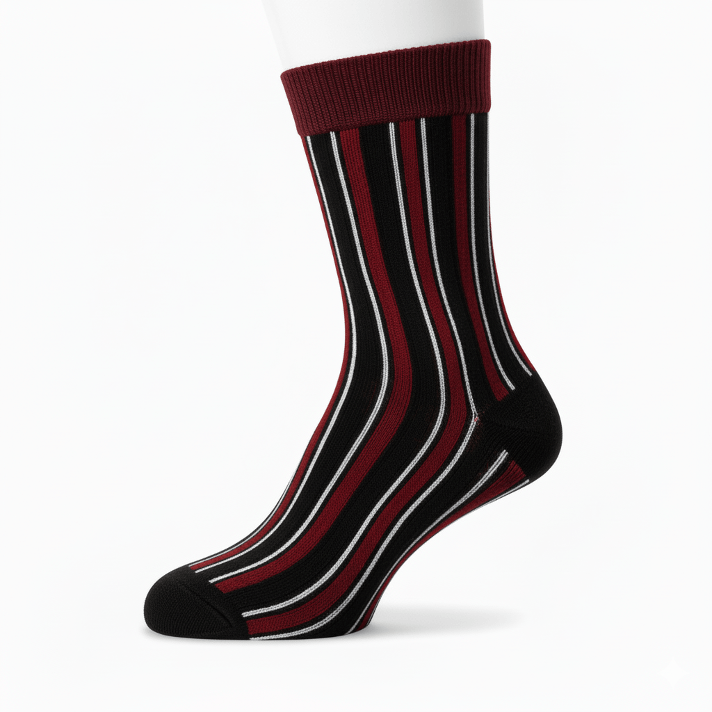 Pel que fa als acabats, la puntera i el taló estan confeccionats en negre sòlid, mantenint la continuïtat amb la base del mitjó i reforçant la sensació d’uniformitat en les zones de major desgast. El detall més distintiu de la peça és la vora superior o puny, realitzada en un vermell fosc sòlid i acanalat. Aquest element no només aporta cohesió amb les ratlles vermelles del disseny, sinó que també crea un contrast refinat i equilibrat amb el negre dominant, tancant la composició amb un acabat visualment molt elegant i ben definit.